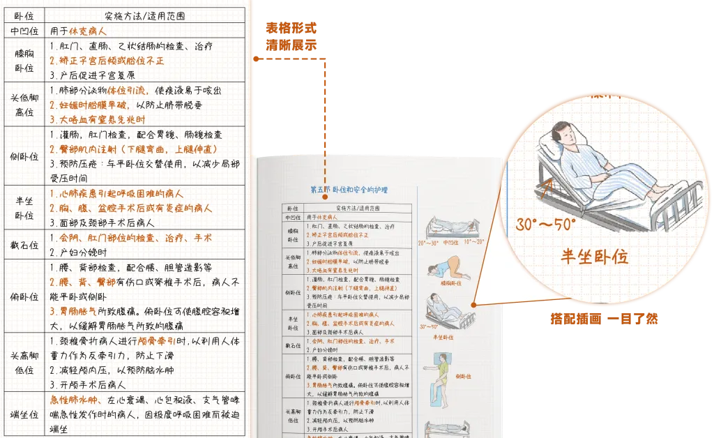 比如 “卧位和安全的护理” 板块,膝胸卧位、半坐卧位都配了直观漫画,连半坐卧位 “30°~50°”、头低脚高位 “15°~30°” 的角度都标注清晰;